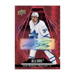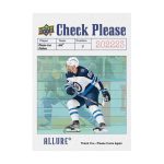 Doubloons are one of the new additions in 2022-23 Upper Deck Allure Hockey. Landing 1:160 hobby packs, they’re tough. The design, which includes laser etching, is double-sided. Check Please is another debut. Putting the spotlight on some of the more physical players in the NHL, base versions are 1:45 packs with one-of-one Golden Treasures and numbered autograph versions also available. After being a surprise in 2021-22 Allure, 16-Bit inserts return for a second round of video game-inspired designs. At 1:810 hobby packs, they’re scarce. All-Time Allure is another rarity with 1:320 pack odds. Allure Quartz have a die-cut design. Veterans are 1:12 packs while rookies fall 1:22.5 packs. Both have Golden Treasures (1/1) parallels. Some also have Autographs (1:500 packs) and Blue Autographs (/10). Blockers (1:5.14 packs), Game Stills (1:9 packs) and Runways (1:9 packs) are among the other new inserts. There’s also the returning Iced Out (1:7.2 packs). All four of these have Red (/299), Green (/99), Purple (/10) and Golden Treasures (1/1) parallels as well as tough inserts.